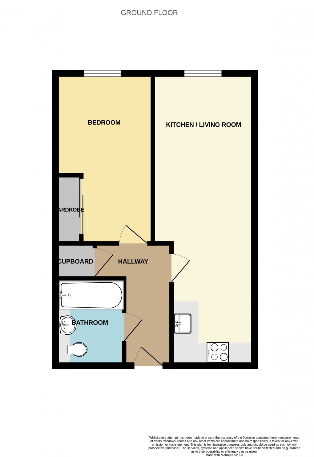 Hallway 6'9" x 10'10" (2.06m x 3.3m) Entering into the property you step into a hallway with laminate flooring, a wall-mounted electric radiator, intercom system, and a cupboard containing the boiler. With doors leading to the living room, bedroom and bathroom. Kitchen / Living Room 9' x 25'11" (2.74m x 7.9m) Open-plan kitchen living area with laminate flooring, wall-mounted electric radiators and a floor to ceiling window facing out to the development's communal courtyard. The kitchen comprises base cabinets with counter top above, integrated washing machine, electric oven and hob with extractor fan above. Bedroom 8'8" x 15'1" (2.64m x 4.6m) Spacious double bedroom with a large fitted wardrobe, carpet flooring, wall-mounted electric radiator, and a floor to ceiling window overlooking the coummunal courtyard. Bathroom 6'1" 7'9" (1.85m 2.36m) With linoleum flooring, painted walls with tiles around splash-prone areas, and a bathroom suite comprising bath with shower above and a glass shower screen, wash basin, wc and towel rail. Property Information Tenure - Leasehold Length of Lease - TBC Ground Rent - TBC Service Charge - TBC EPC Rating - C Council Tax Band - CFloorplan
